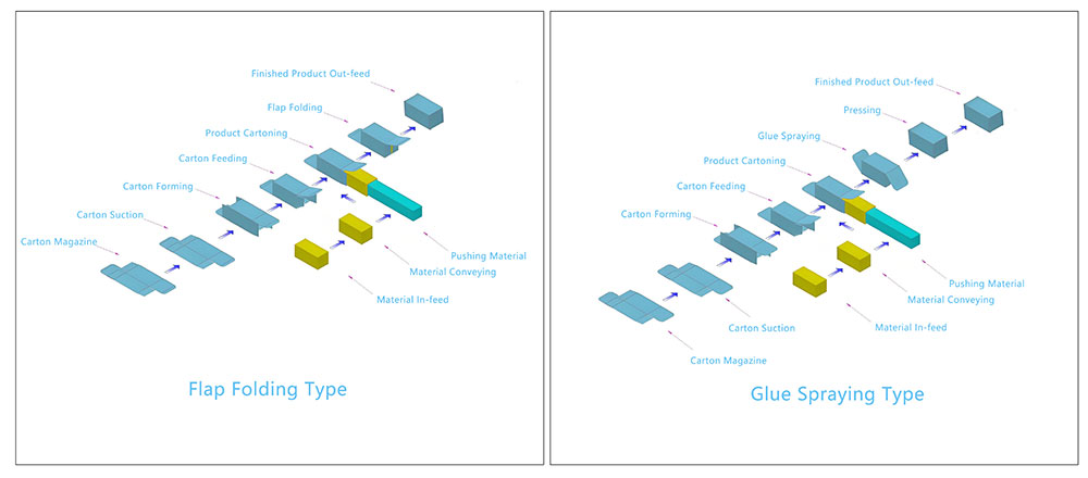 - Movimiento intermitente vs. movimiento continuo : las encartonadoras intermitentes detienen las cajas en cada estación; las máquinas continuas hacen funcionar las cajas y los productos en un movimiento sincronizado y constante para lograr velocidades más altas.